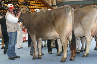 5. Juni 2004 – German Open, Osnabrück Jetway Teddy macht Werbung für die moderne Brown-Swiss-Kuh und läuft auf Rang zwei. Mit einer starken Braunviehgruppe brauchte sich unsere Rasse in der Hochburg der Holsteins wahrlich nicht verstecken.