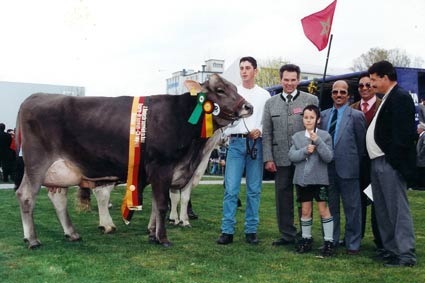 April 2002 – Deutsche Braunviehschau Buchloe: Simvitel-Tochter Europe, die Mutter des KB-Stieres Orion, holt sich einen 1e-Preis. Mehr zu Orion unter www.besamungsstation.eu